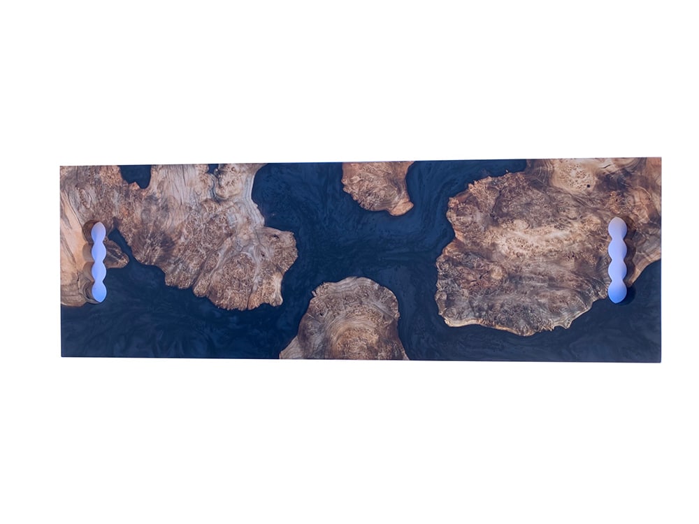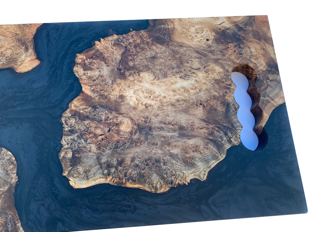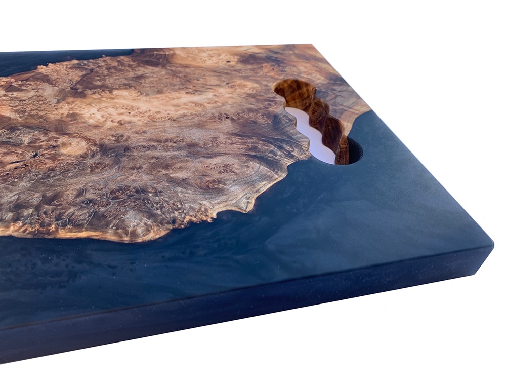 The details in this maple burl are absolutely mesmerizing! And when combined with the Black Onyx colored epoxy, the charcuterie board that has been created is pure elegance!  This is a large board measuring 30″L x 10″W x 1″.  With cutouts on each end, carrying it is made easy. Anything you choose to serve on this board will surely stand out!
